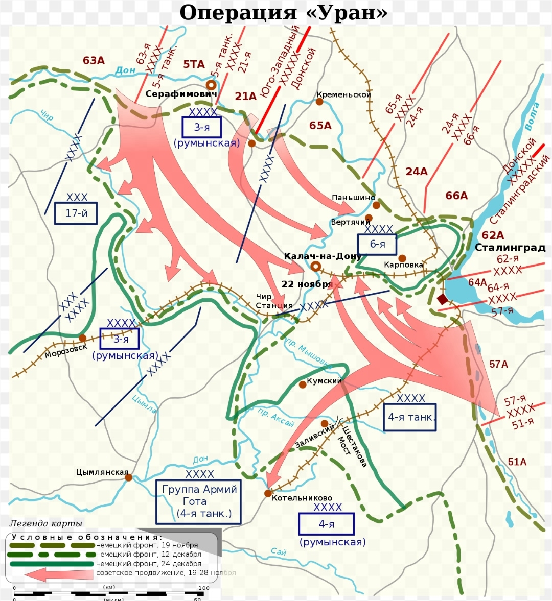 В этот день 23 ноября 1942 года наступающие части Сталинградского и Юго-Западного фронтов сомкнули кольцо окружения в районе хутора Советского. В окружение попали 6 полевая армия фрицев и многочисленные отдельные части и соединения. Всего более 300 тысяч вражеских солдат.
